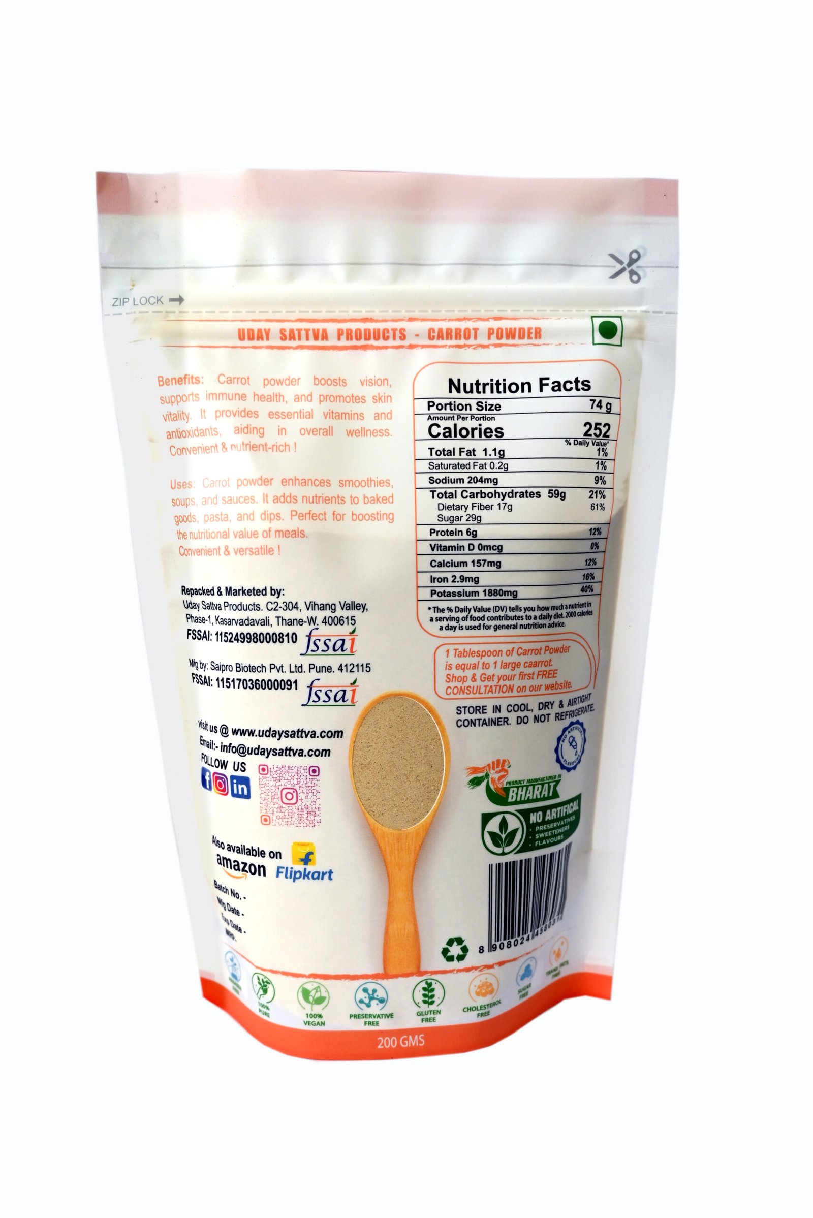 Uday Sattva Carrot Powder Pack Of 1 (Lal Gajar) 200g,100% Pure & Natural Superfood | Rich in Antioxidants, Fiber & Vitamins | Supports Immunity, Skin Glow, Energy & Heart Health ,Ideal for Juice Smoothies, Soups & Healthy Drinks | Uday sattva