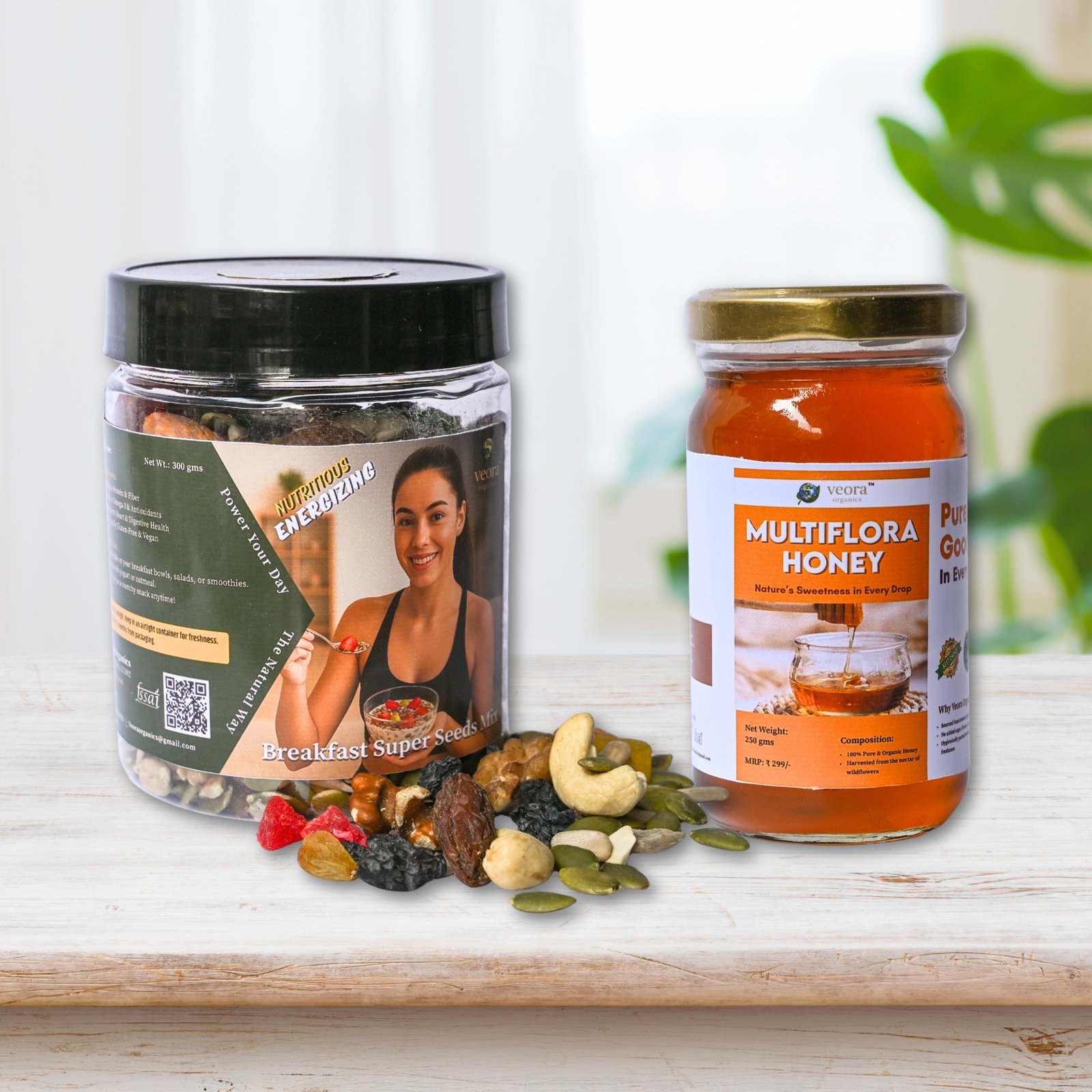 Kickstart your day with Veora Organics Super Breakfast Seeds & Organic Honey Combo, a wholesome and nutritious pair designed to fuel your mornings with energy, vitamins, and natural sweetness. This combo brings together a premium mix of organic seeds and pure, farm-fresh honey, offering a healthy, tasty, and convenient way to nourish your body.