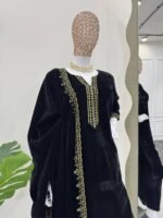 A luxurious ethnic outfit designed for modern celebrations. It combines rich velvet texture with detailed craftsmanship, making it a perfect choice for special occasions.