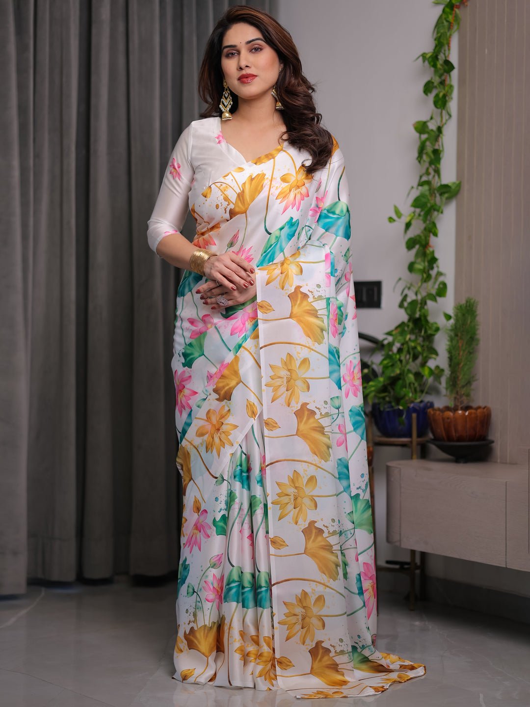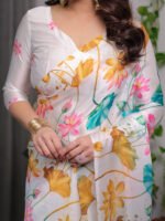 White Satin Georgette Lotus Floral Printed Saree with Attached Blouse – Elegant Watercolor Designer Saree for Festive & Graceful Occasions | Crown Fashion