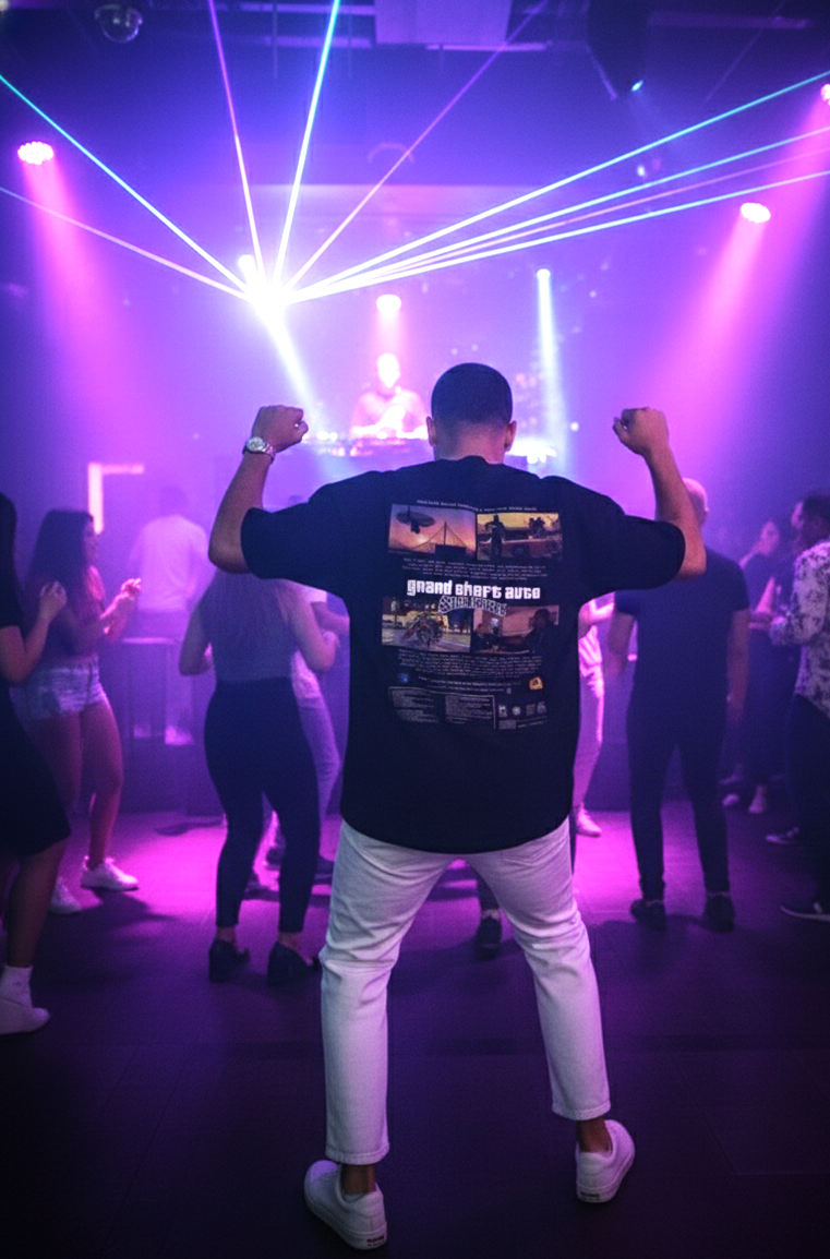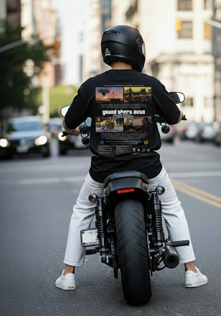 Step into the world of bold street fashion with this GTA Inspired Black Oversized T-Shirt, designed for those who live life on their own rules. Featuring a striking retro game-style back graphic, this T-shirt captures the raw energy of urban nightlife, biker culture, and modern streetwear aesthetics.