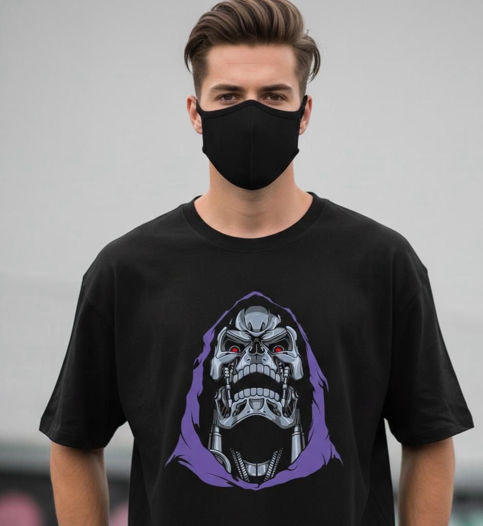 Unleash your dark side with this bold Men’s Graphic Black T-Shirt, designed for those who love powerful streetwear aesthetics. Featuring a fierce robotic skull reaper design with glowing red eyes, this tee delivers a perfect mix of attitude, mystery, and modern style.