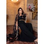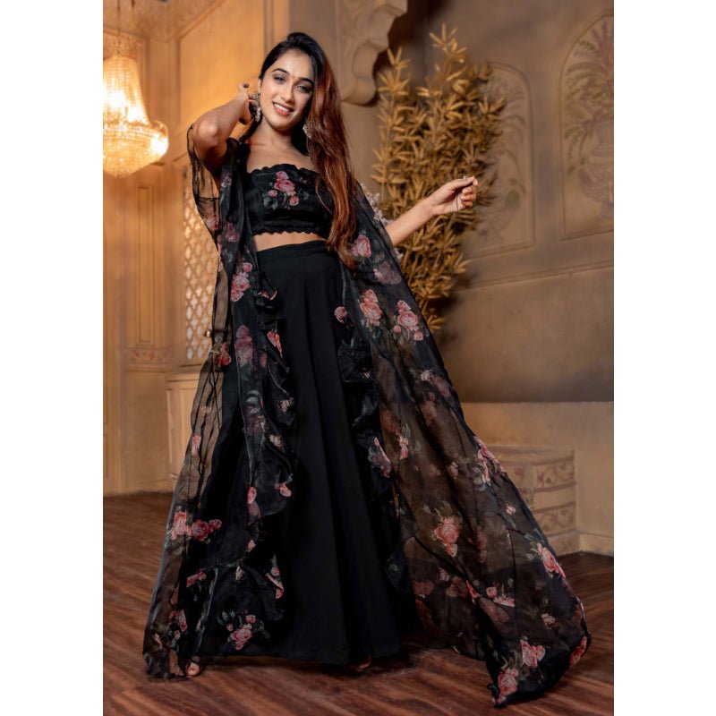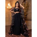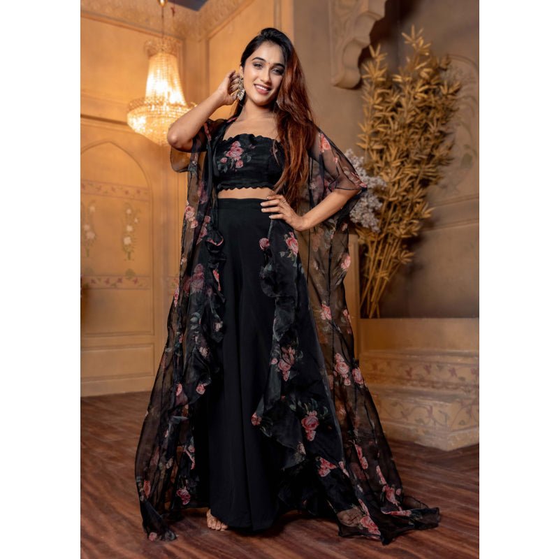 Make a bold fashion statement with this black floral Indo-western co-ord set, designed for a glamorous and elegant look. Featuring a chic crop top paired with wide palazzo pants and a sheer long floral shrug, this outfit blends modern sophistication with festive charm. The flowy shrug adds drama and grace, making it perfect for special occasions.