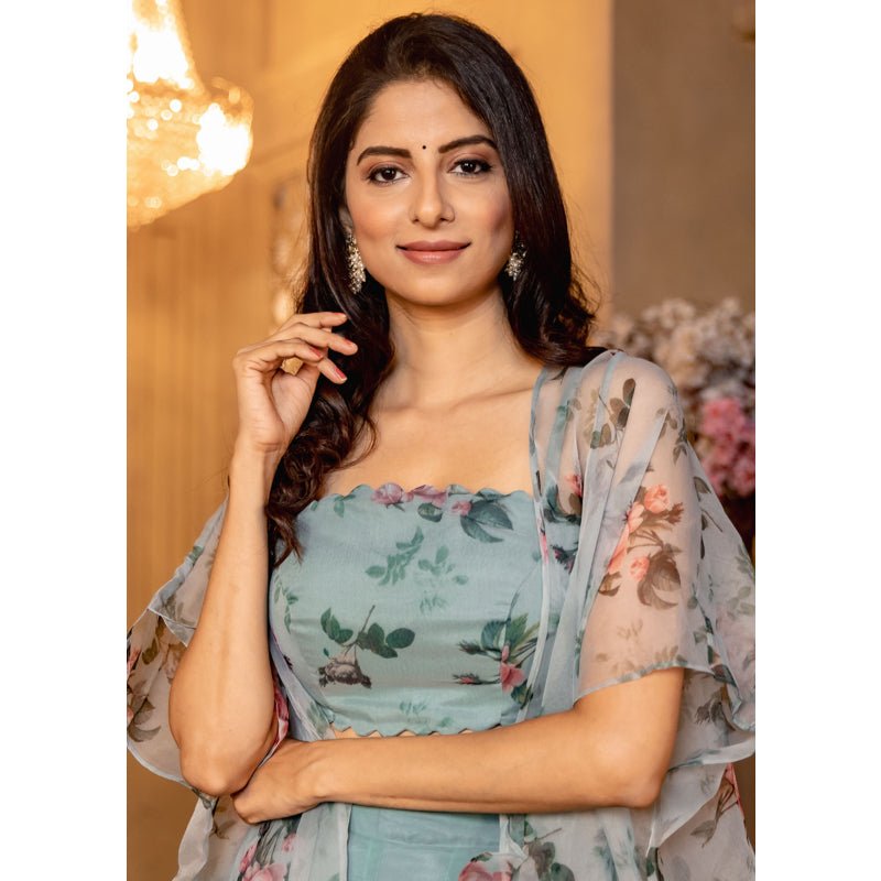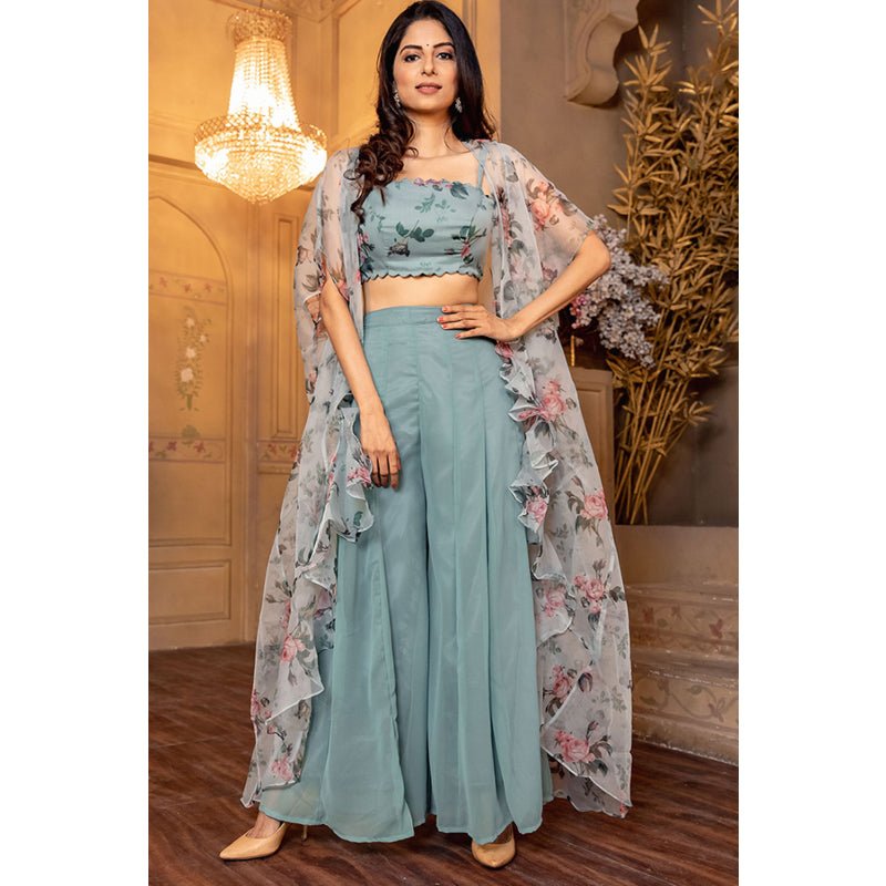 Step into elegance with this sea green floral Indo-western co-ord set, crafted to give you a refreshing and graceful look. The stylish crop top paired with flowy palazzo pants and a sheer floral shrug creates a perfect blend of modern design and feminine charm. The soft pastel tones and floral prints add a soothing and classy vibe, ideal for special occasions.