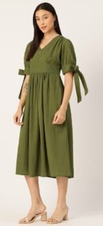 Embrace understated elegance with this olive green midi dress, crafted from soft textured cotton for breathable comfort and refined style. Featuring a flattering empire waist and gentle gathers, this dress drapes beautifully to create a graceful silhouette. The V-neckline with delicate button detailing adds a subtle focal point, while the puff sleeves finished with charming tie-up bows lend a feminine, contemporary touch. Perfect for everyday wear, casual outings, or relaxed gatherings, this versatile dress combines comfort with effortless sophistication.