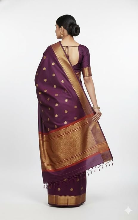 Women’s Banarasi Silk Saree – Rich Wine Purple with All Over Zari Buti Work, Gold Zari Border & Pallu for Wedding & Festive Use | DIMANI INNOVATIVE SOLUTIONS