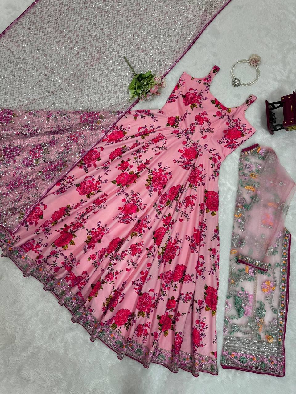 Butterfly net designer top, front & back heavy sequence work, American silk printed gown, soft micro inner lining, 4.5-meter flair, fully stitched fit, matching net dupatta with sequence work, lightweight festive wear outfit.