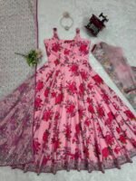 Elegant designer gown set crafted with butterfly net top featuring heavy thread and sequence work on both front and back. The inner gown is made from premium American silk with digital print and subtle sequence detailing, offering a rich festive appearance. Designed with a 4.5-meter flair for a voluminous look. Completed with a matching butterfly net dupatta enhanced with sequence work, perfect for weddings and special occasions.