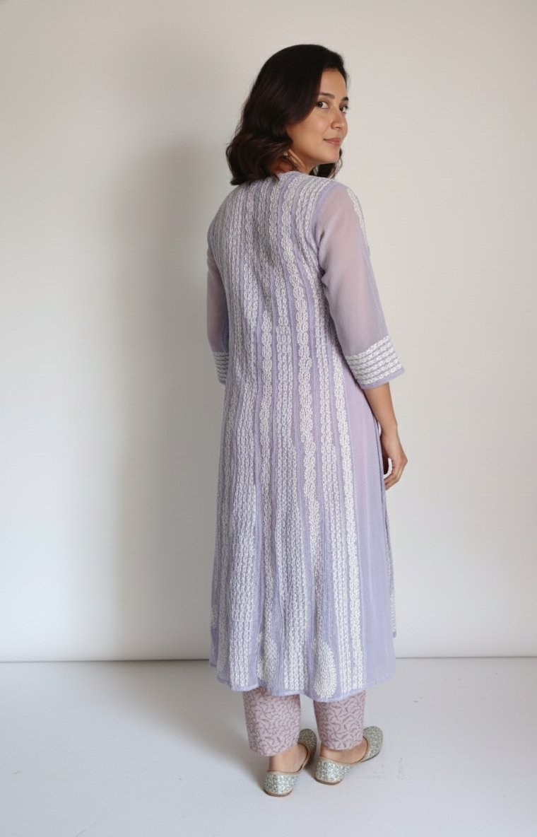 This beautifully embroidered sheer kurti showcases intricate Chikankari-inspired craftsmanship in a modern pastel tone. The airy fabric and fine embroidery create a delicate, graceful drape that flatters every movement. Ideal for festive wear, evening events, and elegant ethnic styling, this kurti adds a touch of luxury and tradition to your wardrobe.