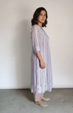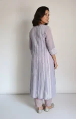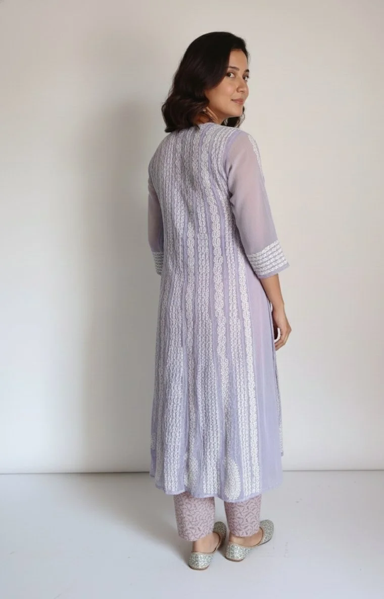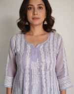 This beautifully embroidered sheer kurti showcases intricate Chikankari-inspired craftsmanship in a modern pastel tone. The airy fabric and fine embroidery create a delicate, graceful drape that flatters every movement. Ideal for festive wear, evening