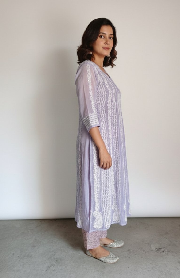 This beautifully embroidered sheer kurti showcases intricate Chikankari-inspired craftsmanship in a modern pastel tone. The airy fabric and fine embroidery create a delicate, graceful drape that flatters every movement. Ideal for festive wear, evening events, and elegant ethnic styling, this kurti adds a touch of luxury and tradition to your wardrobe.