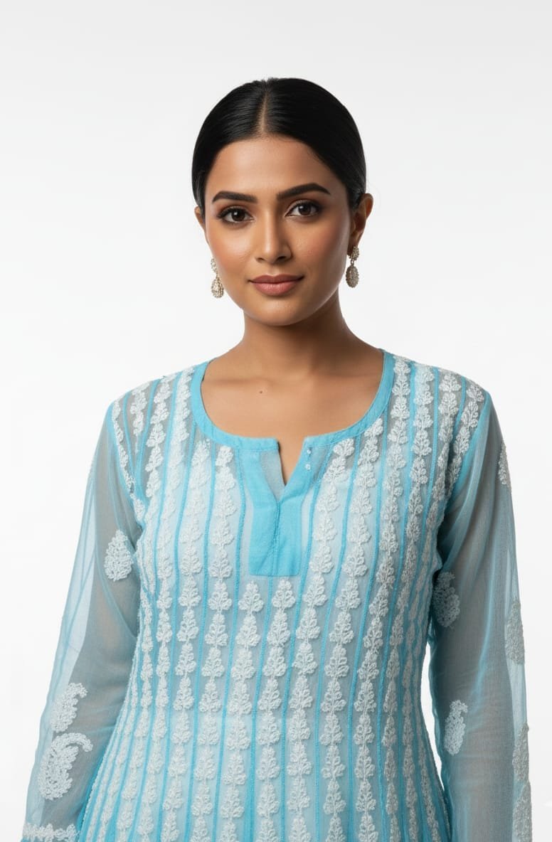 This stunning flared sheer kurti showcases masterful Chikankari-inspired embroidery across a dramatic, voluminous silhouette. The ultra-lightweight fabric is adorned with intricate vertical patterns and a rich paisley border at the hem, creating a regal and ethereal look. Designed for high-impact ethnic styling, this piece adds a layer of sheer luxury and traditional elegance to any festive ensemble.