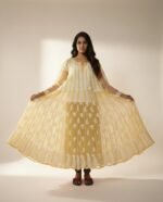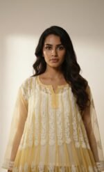 This stunning flared sheer kurti showcases masterful Chikankari-inspired embroidery across a dramatic, voluminous silhouette. The ultra-lightweight fabric is adorned with intricate vertical patterns and a rich paisley border at the hem, creating a regal and ethereal look. Designed for high-impact ethnic styling, this piece adds a layer of sheer luxury and traditional elegance to any festive ensemble.