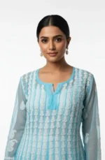 This stunning flared sheer kurti showcases masterful Chikankari-inspired embroidery across a dramatic, voluminous silhouette. The ultra-lightweight fabric is adorned with intricate vertical patterns and a rich paisley border at the hem, creating a regal and ethereal look. Designed for high-impact ethnic styling, this piece adds a layer of sheer luxury and traditional elegance to any festive ensemble.
