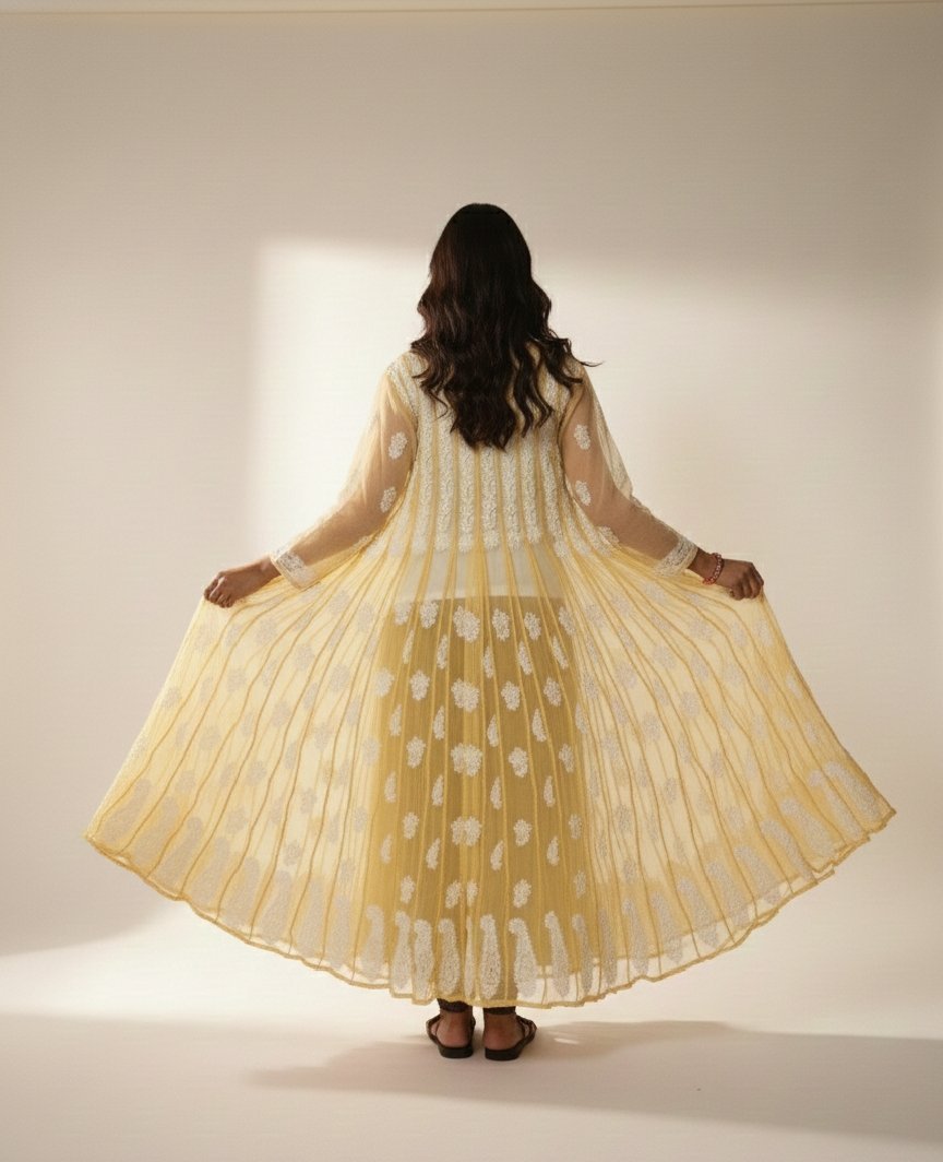This stunning flared sheer kurti showcases masterful Chikankari-inspired embroidery across a dramatic, voluminous silhouette. The ultra-lightweight fabric is adorned with intricate vertical patterns and a rich paisley border at the hem, creating a regal and ethereal look. Designed for high-impact ethnic styling, this piece adds a layer of sheer luxury and traditional elegance to any festive ensemble.