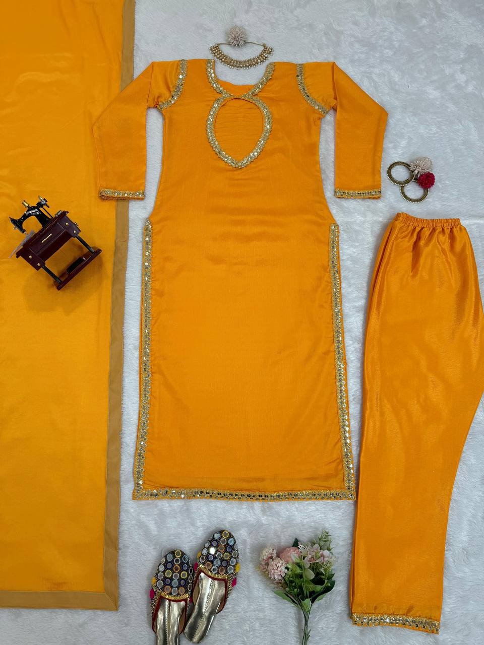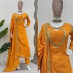 Elegant kurta pant set made from premium chinon silk fabric, featuring fine thread embroidery with 9mm sequence work for a rich and festive look. The kurta comes with soft micro inner lining and a flattering 47-inch length. Paired with a fully stitched elastic waist pant for comfort and ease. The matching chinon silk dupatta with lace border enhances the overall appeal, making it ideal for festive and occasion wear.