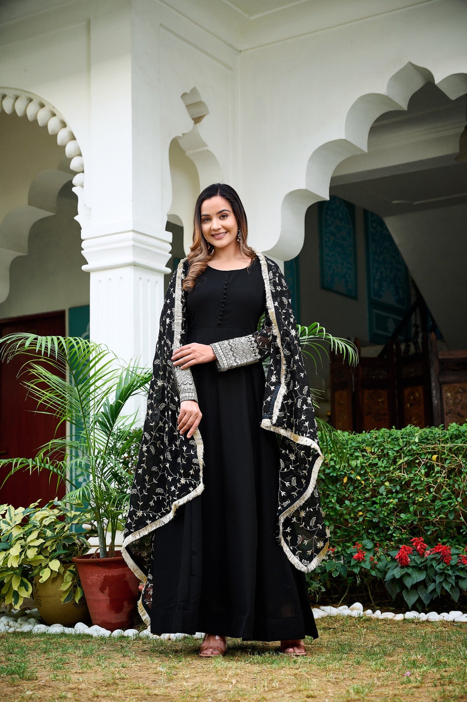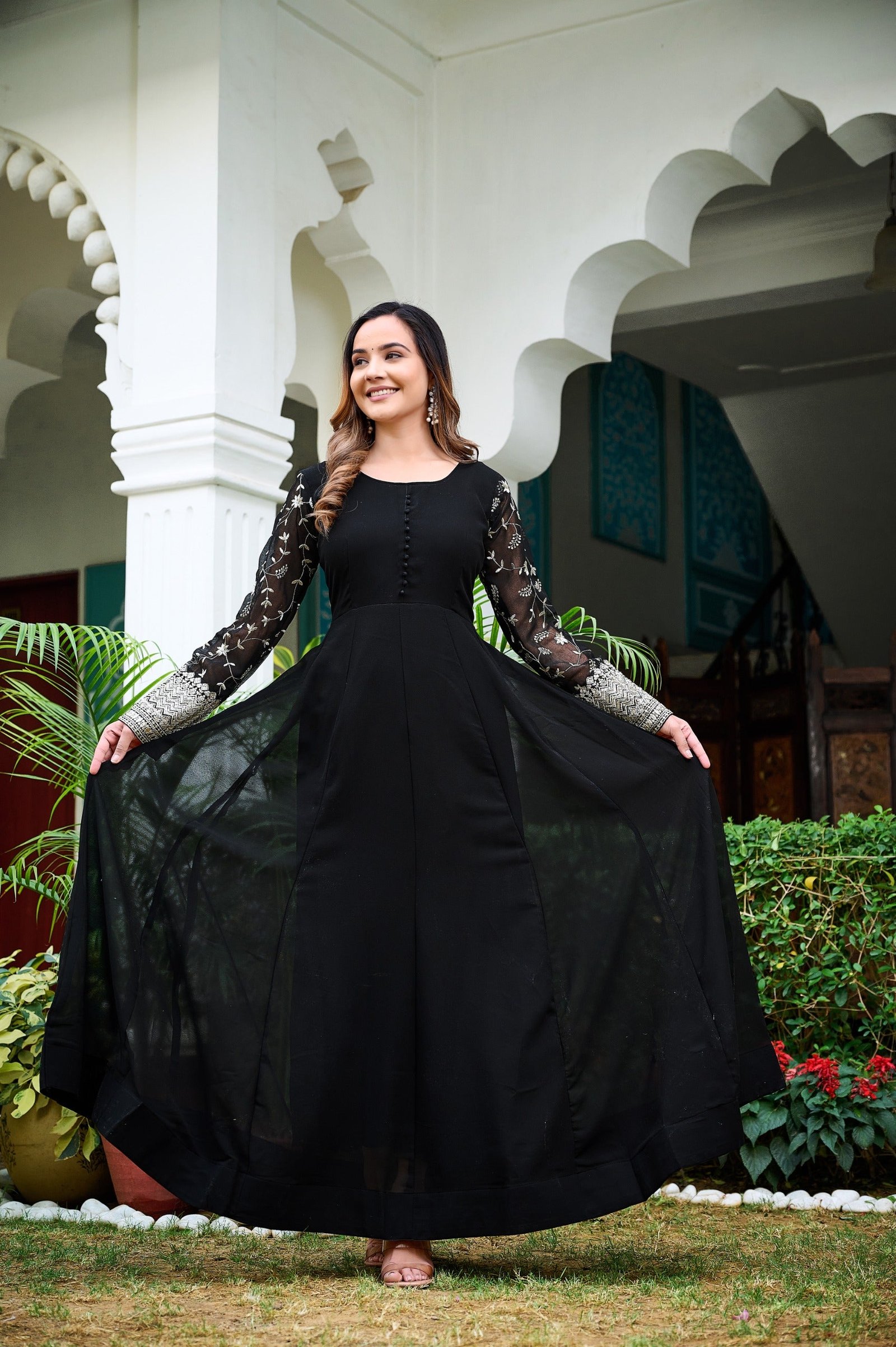 Exude elegance and sophistication with this classic black Anarkali gown, designed for a timeless and graceful look. The beautifully flared silhouette creates a dramatic flow, while the sheer embroidered sleeves add a touch of delicate charm. Perfect for evening events and festive occasions, this outfit offers a perfect blend of modern style and traditional elegance.