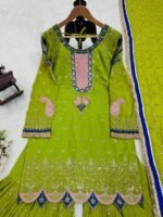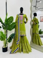 Premium faux georgette fabric, detailed thread and sequence embroidery, comfortable micro inner lining, fully stitched sharara with elastic waist, adjustable size margin, elegant dupatta with lace border, lightweight and easy to carry, ideal for festive and party wear.