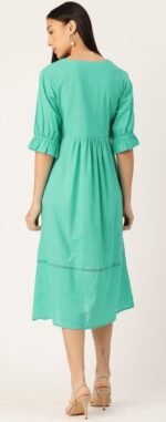 Refresh your wardrobe with this elegant mint green midi dress, designed for effortless style and all-day comfort. Crafted from breathable cotton fabric, this dress features delicate white floral embroidery along the neckline and hem, adding a graceful feminine touch. The relaxed A-line silhouette with gathered waist ensures a flattering drape, while the soft flare sleeves enhance its charming appeal. Perfect for casual outings, brunch dates, or summer gatherings, this dress combines comfort and sophistication in one timeless piece.