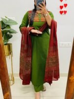 Be the first to review “Women’s Forest Green Cotton Kurta Set with Embroidered Yoke and Printed Maroon Dupatta | Komal Collection” Cancel reply