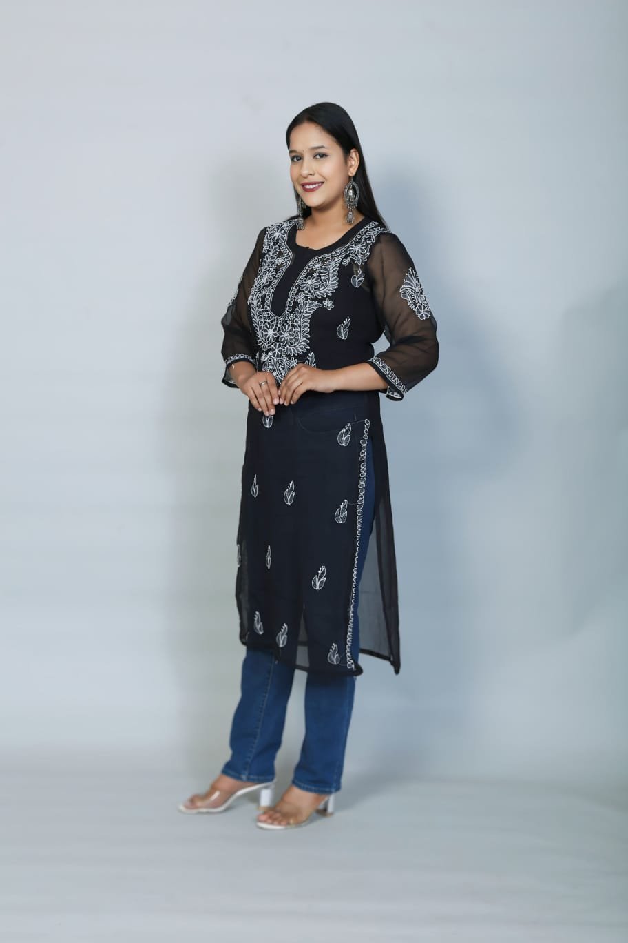 This elegantly crafted sheer kurti features exquisite Chikankari-inspired threadwork set against a classic, sophisticated black backdrop. The lightweight, airy fabric and detailed floral embroidery offer a refined, graceful silhouette that blends traditional artistry with modern flair. Perfect for evening celebrations, festive events, or sophisticated ethnic gatherings, this kurti brings a timeless and stylish touch to your wardrobe.