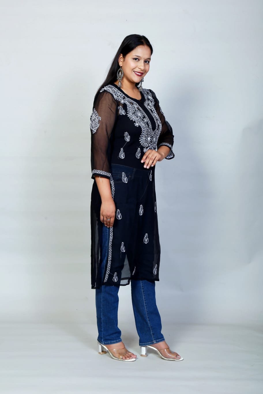 This elegantly crafted sheer kurti features exquisite Chikankari-inspired threadwork set against a classic, sophisticated black backdrop. The lightweight, airy fabric and detailed floral embroidery offer a refined, graceful silhouette that blends traditional artistry with modern flair. Perfect for evening celebrations, festive events, or sophisticated ethnic gatherings, this kurti brings a timeless and stylish touch to your wardrobe.