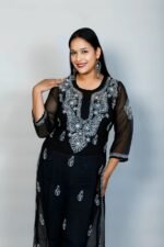 This elegantly crafted sheer kurti features exquisite Chikankari-inspired threadwork set against a classic, sophisticated black backdrop. The lightweight, airy fabric and detailed floral embroidery offer a refined, graceful silhouette that blends traditional artistry with modern flair. Perfect for evening celebrations, festive events, or sophisticated ethnic gatherings, this kurti brings a timeless and stylish touch to your wardrobe.