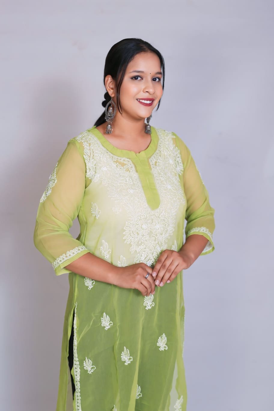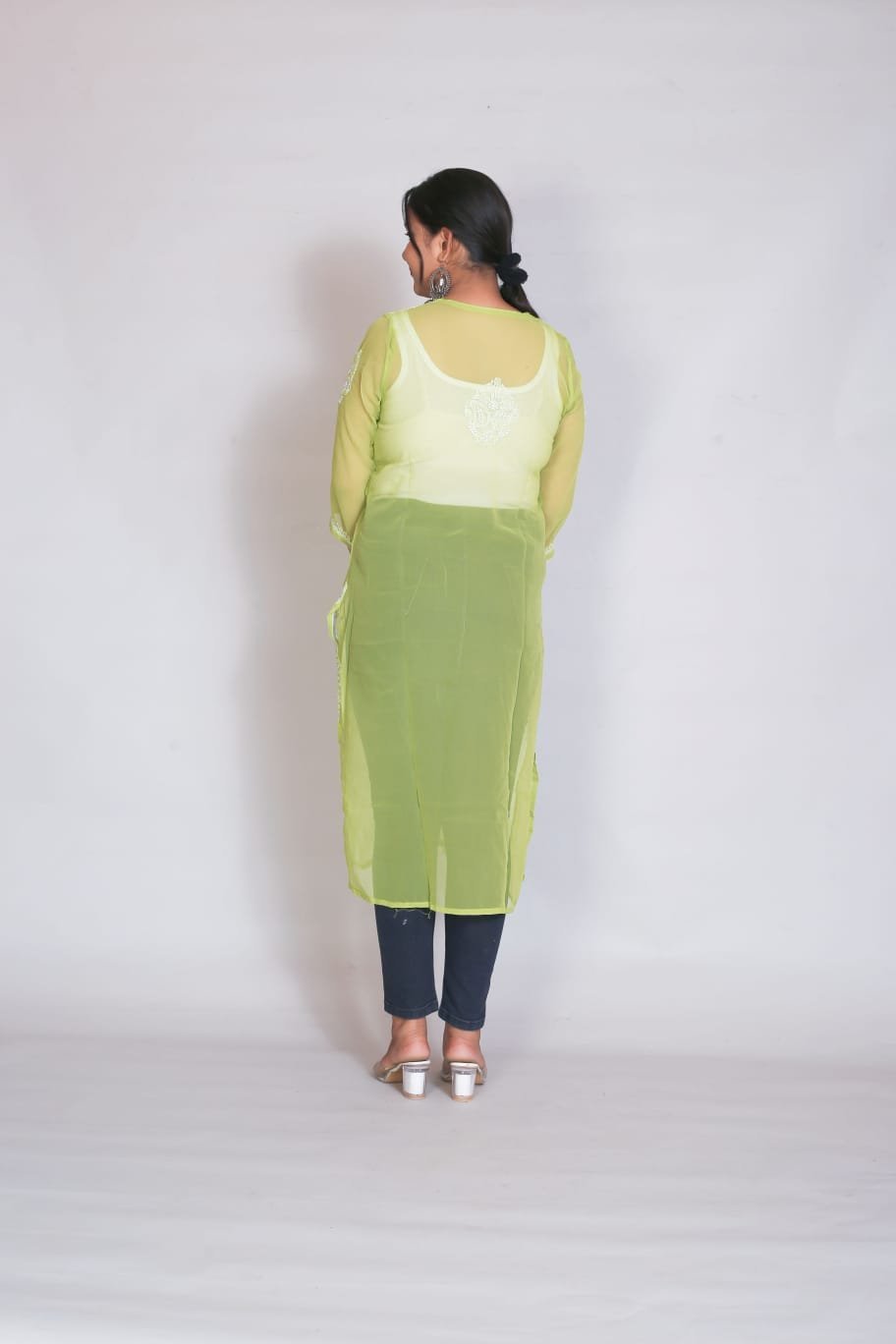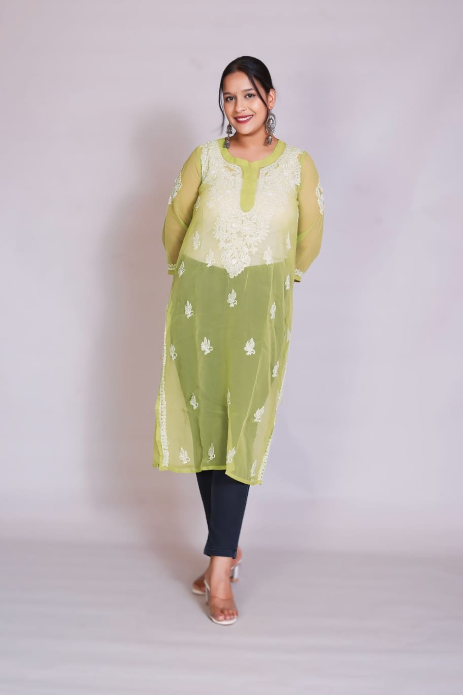 This elegantly crafted sheer kurti features exquisite Chikankari-inspired threadwork set against a vibrant, refreshing lime backdrop. The lightweight, airy fabric and detailed floral embroidery offer a refined, graceful silhouette that blends traditional artistry with modern flair. Perfect for festive celebrations, daytime events, or sophisticated ethnic gatherings, this kurti brings a luminous and stylish touch to your wardrobe.