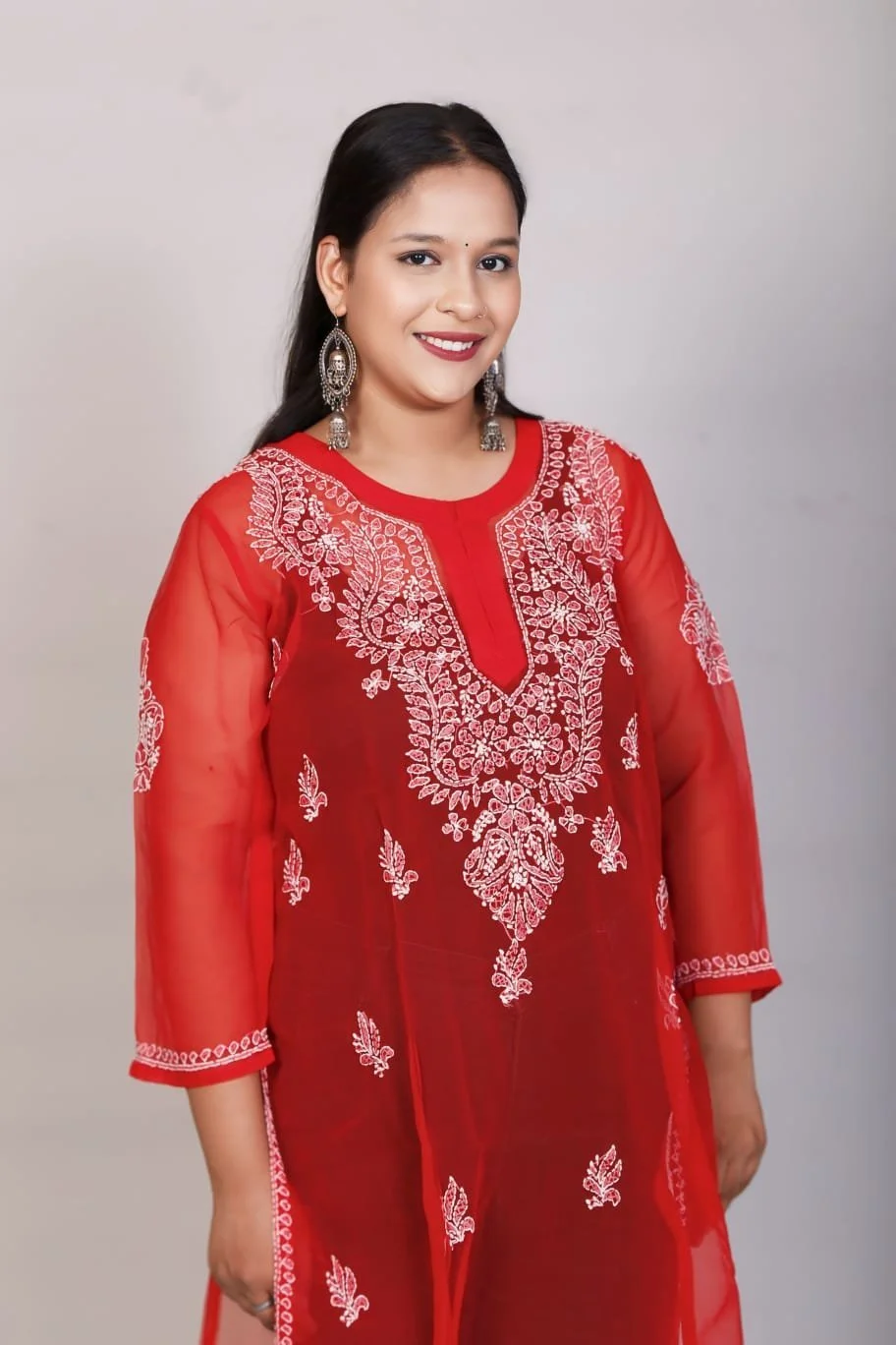Women’s Gala booty Red Chikankari kurti | Lovely Fashion House
