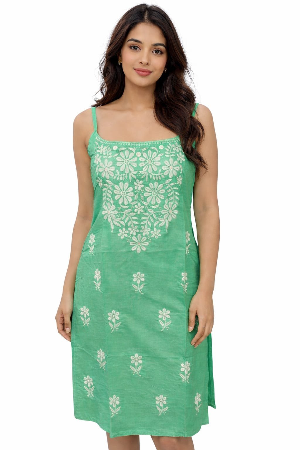Add a fresh and graceful touch to your ethnic wardrobe with this women’s mint green Lucknowi Chikankari straight kurti. Beautifully detailed with elegant white floral embroidery on the front and scattered motifs across the fabric, this kurti blends traditional artistry with modern simplicity. The soothing mint green shade gives it a soft, stylish appeal, while the sleeveless strap design makes it a perfect choice for warm-weather comfort. Ideal for casual outings, daily wear, festive gatherings, and ethnic styling, this kurti pairs effortlessly with leggings, palazzos, straight pants, or denim.