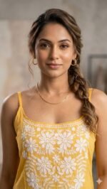 Bring effortless elegance to your ethnic collection with this women’s mustard yellow Lucknowi Chikankari kurti. Adorned with intricate white floral embroidery on the front, this kurti beautifully blends traditional craftsmanship with modern styling. The soft yellow shade adds a fresh and graceful charm, while the sleeveless strap design offers a stylish and comfortable fit. Perfect for casual outings, festive gatherings, brunch wear, and daily ethnic fashion, this kurti pairs wonderfully with leggings, palazzos, jeans, or straight pants.