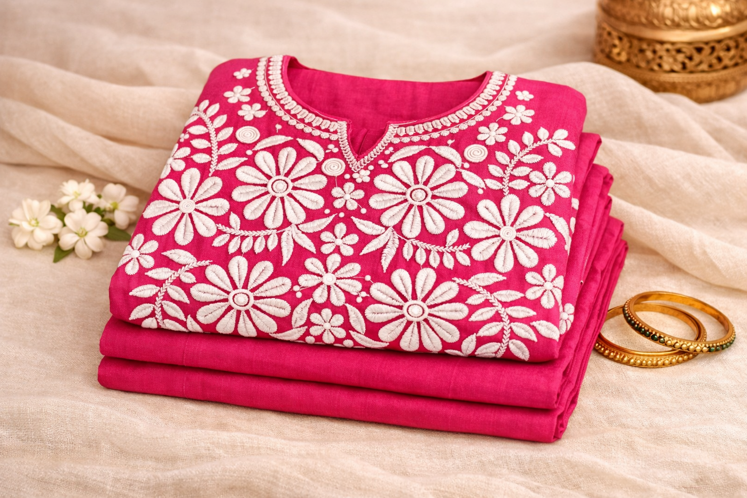 Add a pop of color and elegance to your ethnic collection with this beautiful pink embroidered kurti for women. Featuring intricate white floral embroidery on a vibrant pink base, this kurti showcases detailed craftsmanship that blends traditional design with modern style. The delicate floral patterns create a graceful and eye-catching look, making it ideal for casual outings, festive occasions, and everyday ethnic wear.