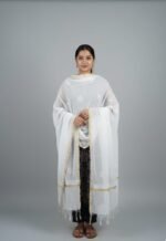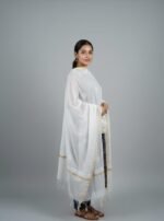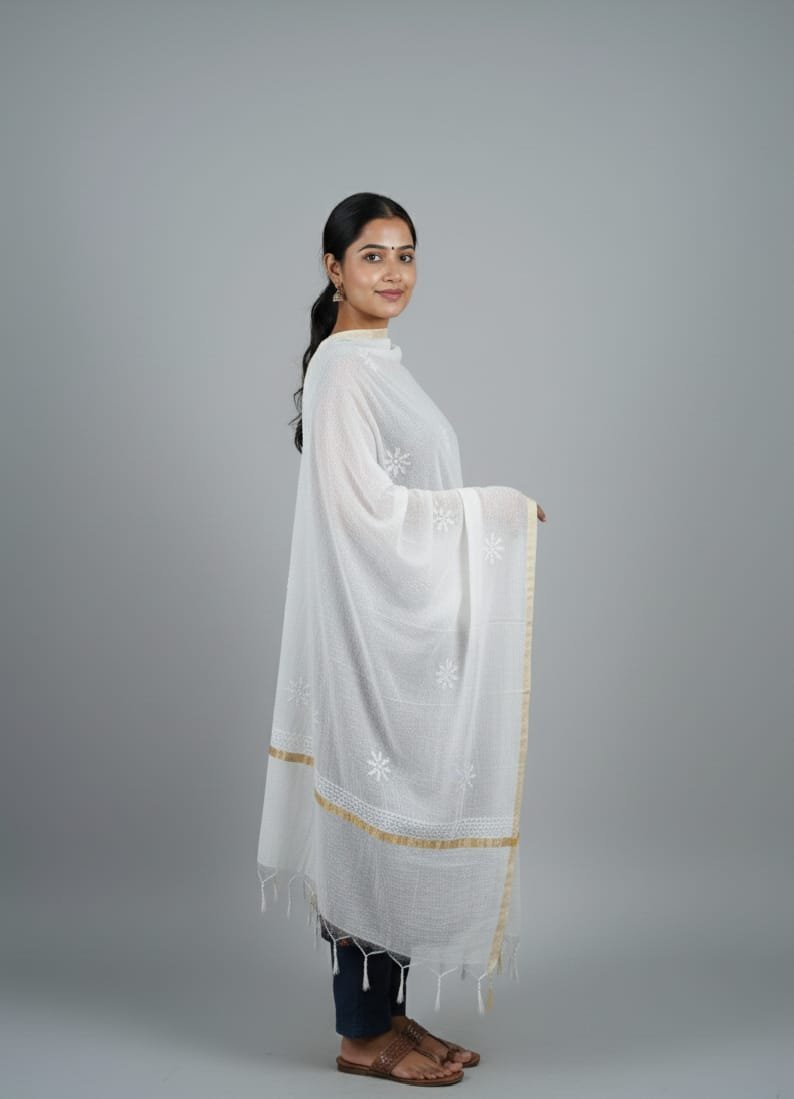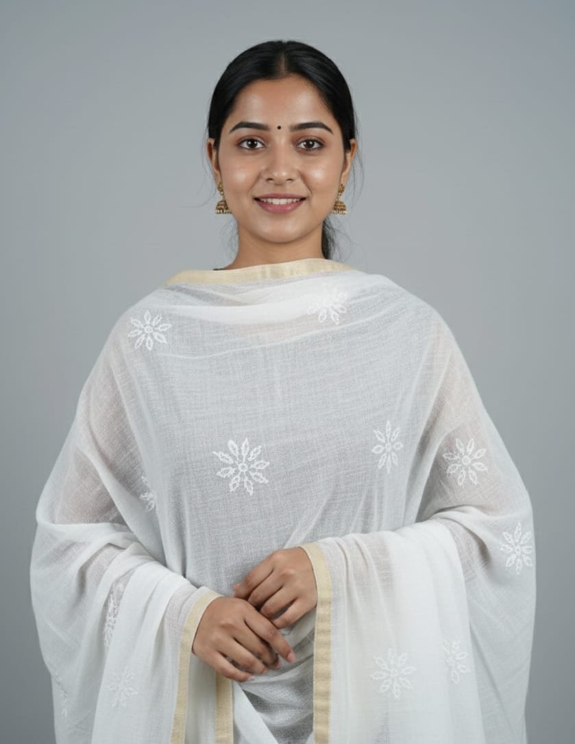 This elegantly crafted ethnic dupatta features delicate white thread embroidery on a lightweight, breathable base. Designed with a timeless aesthetic, it is adorned with subtle floral motifs and finished with a sophisticated gold zari border that adds a hint of festive shimmer. Whether draped over a simple suit or a heavy anarkali, this versatile accessory enhances any traditional ensemble with its graceful drape and refined craftsmanship.