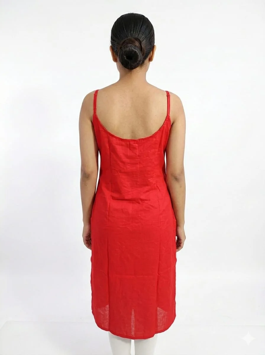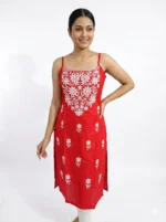 Add elegance to your ethnic wardrobe with this beautiful women’s red embroidered straight kurti. Designed with delicate white floral embroidery on the front and scattered motifs throughout, this kurti offers a graceful and stylish look. The sleeveless design with slim shoulder straps gives it a modern touch, while the straight silhouette ensures comfort and easy wear. Perfect for casual outings, festive gatherings, daily wear, and summer styling, this kurti pairs beautifully with leggings, palazzos, or straight pants.