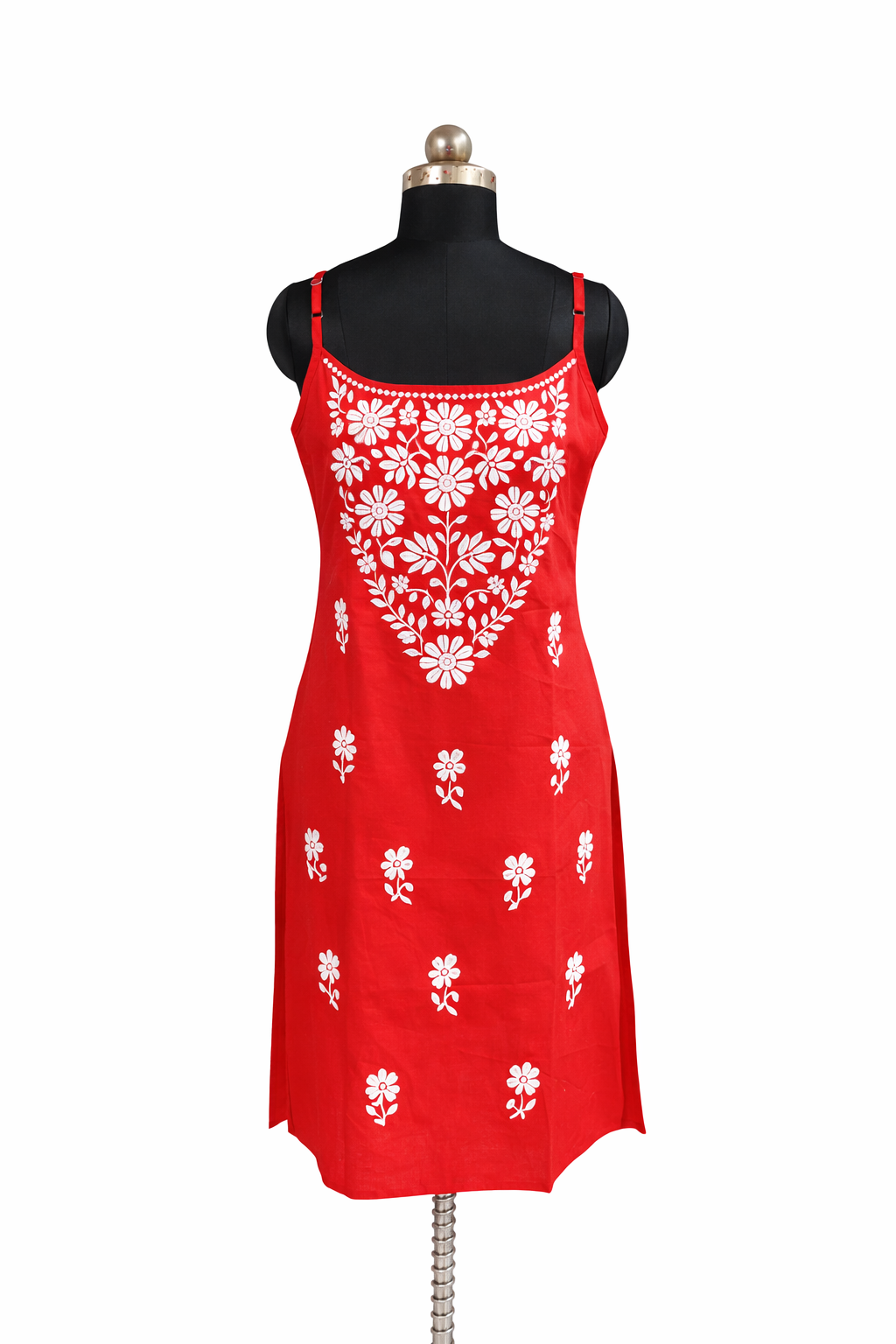 Add a touch of elegance and vibrant style to your wardrobe with this beautiful red embroidered women’s kurti dress. Designed with delicate white floral embroidery on the front, this outfit combines traditional craftsmanship with modern fashion. The sleeveless design with thin shoulder straps provides a comfortable and stylish look, perfect for casual outings, summer wear, or festive occasions. Made from soft and breathable fabric, this kurti ensures comfort throughout the day while keeping you fashionable and confident.