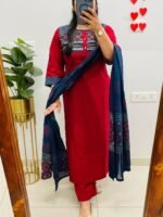Color: Intense Ruby Red Kurta with a Navy Blue and cream printed dupatta.
