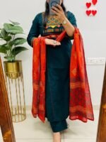 Be the first to review “Women’s Teal Elegance – Embroidered Cotton Kurta Set with Bandhani Print Dupatta | Komal Collection” Cancel reply