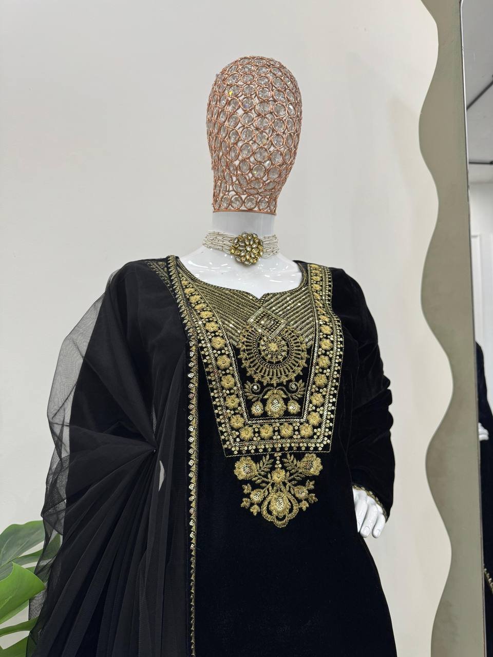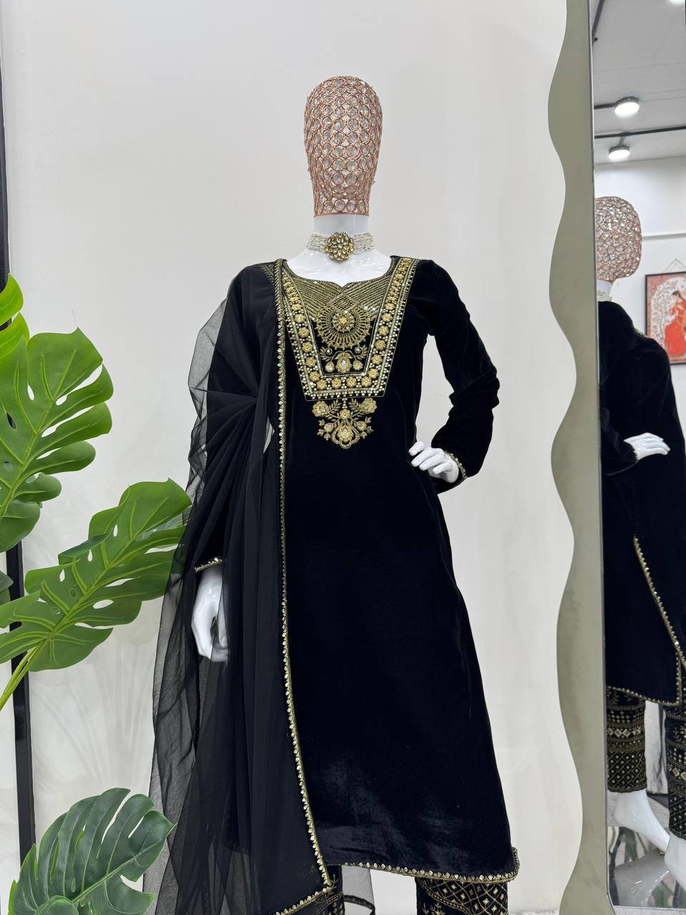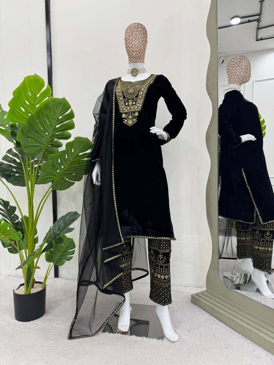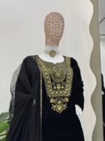 Viscose velvet fabric, elegant thread and sequence embroidery, soft inner lining, fully stitched pant with elastic waist, ready-to-wear sizes, lightweight feel, designer dupatta with lace border, suitable for festive and occasion wear.