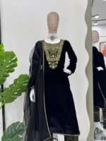 Premium kurta pant set crafted in rich viscose velvet fabric featuring detailed thread and sequence work. The kurta is lined with soft micro fabric for comfort and comes in multiple ready sizes. The matching pant is fully stitched with elastic waist for a flexible fit. Completed with a stylish butterfly net dupatta enhanced with lace border, this set is ideal for festive and party wear.