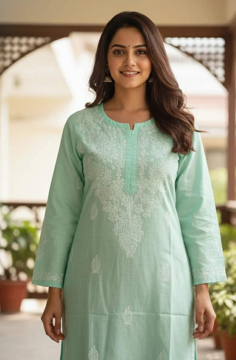 Women’s Voil cotton Chikankari Seafoam Green kurti | FashionHub