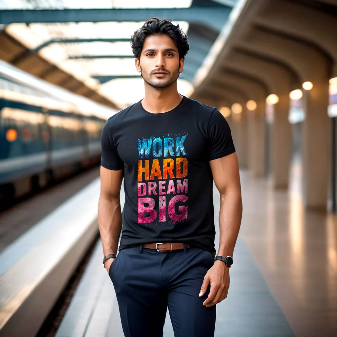 Make a bold style statement with this black printed T-shirt featuring the inspiring “Work Hard Dream Big” graphic on the front. Designed for everyday comfort and modern casual wear, this T-shirt combines a classic silhouette with vibrant motivational typography. The soft and breathable fabric keeps you comfortable throughout the day, while the round neck and half sleeves add timeless appeal. Ideal for casual outings, daily wear, travel, or relaxed weekends, this T-shirt is perfect for those who like fashion with a positive message.