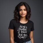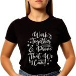 Show the power of teamwork and positivity with this stylish black printed T-shirt featuring the motivational quote “Work Together & Prove That We Can.” Designed with elegant handwritten-style typography and decorative elements, this T-shirt delivers a bold yet inspiring look. The classic black base highlights the white graphic print, making it stand out while remaining easy to style. Crafted from soft and breathable fabric, it ensures comfortable wear throughout the day, perfect for casual outings, daily wear, or relaxed weekends.