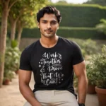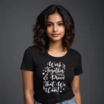 Make a statement with this black graphic printed T-shirt, designed for everyday comfort and style. Featuring a motivational typography print “Work Together & Prove That We Can!”, this tee adds a bold and inspiring touch to your casual wardrobe. Crafted from soft cotton fabric, it ensures comfort throughout the day.