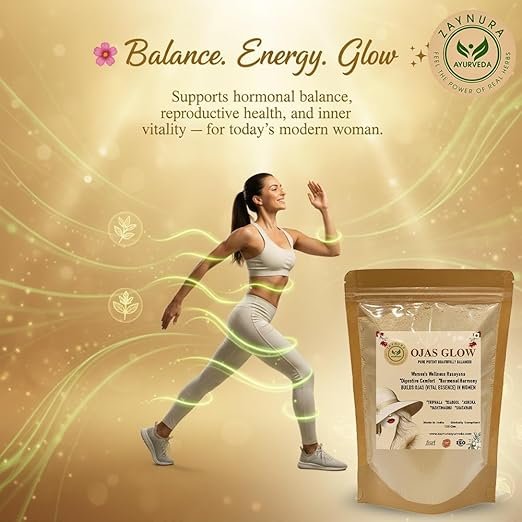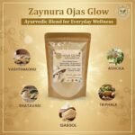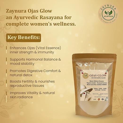 - Ayurvedic Women’s Wellness Formula: Zaynura Ayurveda Ojas Glow is a premium Ayurvedic supplement for women that supports hormonal balance, fertility, and overall vitality. It enhances Ojas (vital essence) — the foundation of inner glow, strength, and feminine energy.